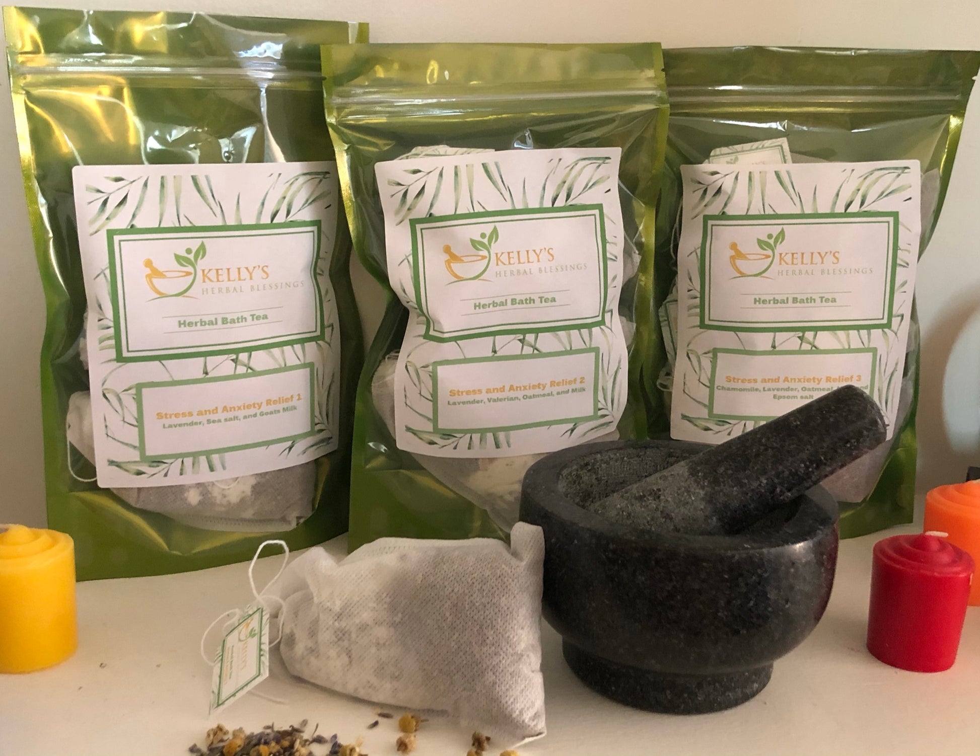 🌿 Stress Relief 3 – A comforting infusion of Chamomile Flowers, Lavender Flowers, Oatmeal, Powdered Milk, and Epsom Salt for ultimate stress relief.